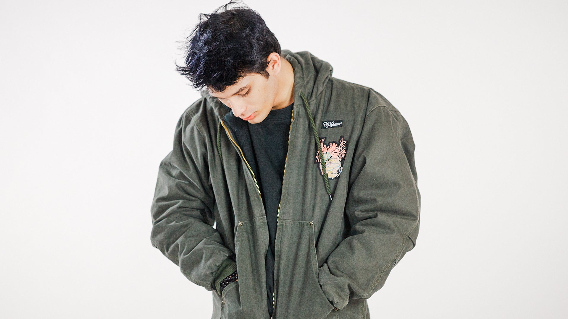 New York City Arteries hand sewn embroidery navy gasoline jacket with metal zipper & brown collar