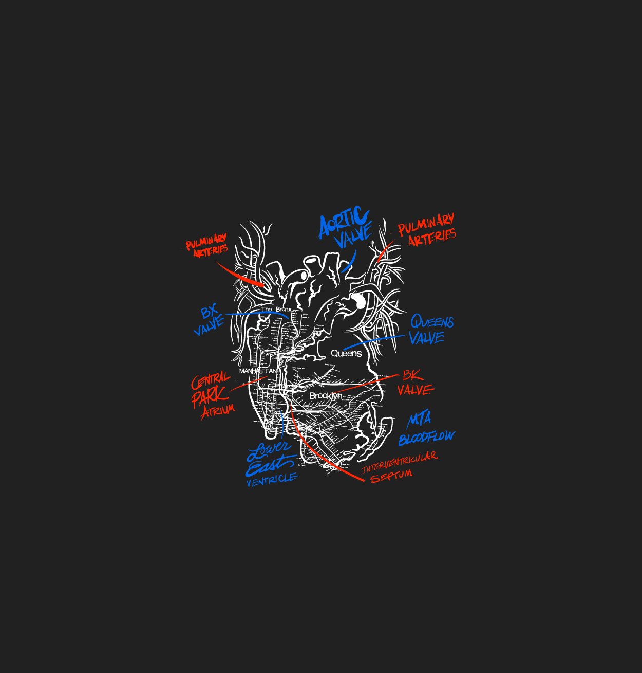 New York City Arteries is a captivating and thought-provoking piece of art by PJ O’Rourke that reimagines the iconic New York City Subway Map in the shape of a human heart. This unique design is a testament to the artist’s personal journey and deep connection with the city's subway system, and it serves as a powerful symbol of the vital role that the MTA and the subway play in shaping the artist’s life and the city itself.