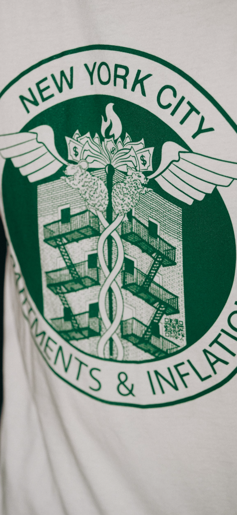 Atop the staff, a pile of burning money symbolizes inflation, while the fire escapes on the depicted apartment building suggest a longing to escape to simpler times. This design uses humor to address a serious issue, embodying the adage that laughter is a potent remedy for navigating tough times.