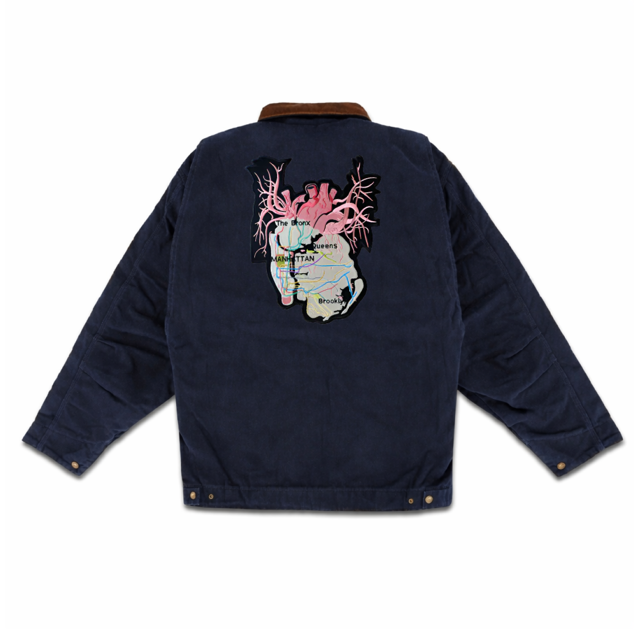 The New York City Arteries patch is hand sewn on the back, placed boldly at the center of the upper shoulders, with a PJ O’Rourke signature patch on the left chest and a smaller Arteries patch beneath it. Dense embroidery and high thread count give the artwork lasting depth and presence.