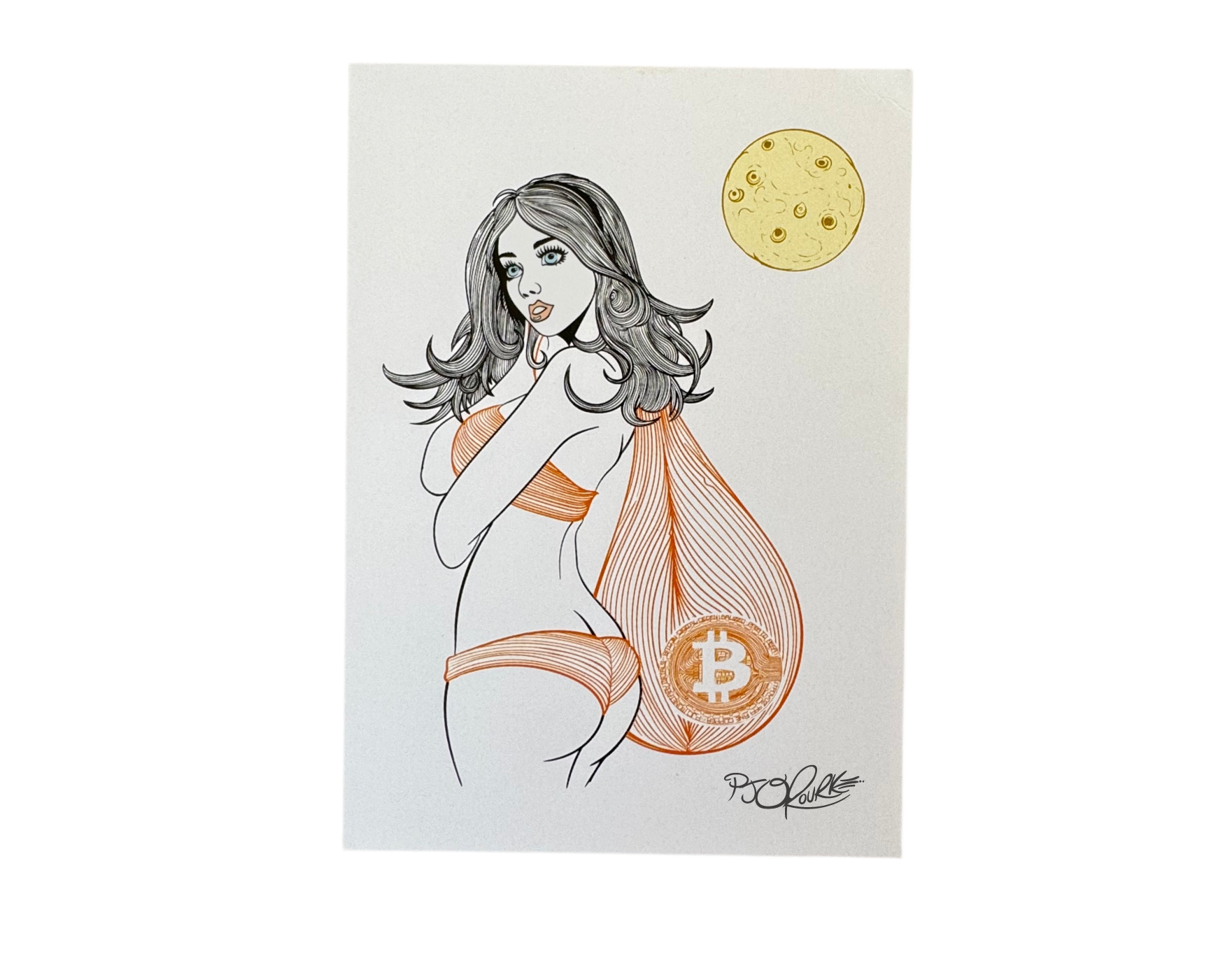 This captivating image of the “Bitcoin Girl” shows her with her bags packed, looking back with a glance of mystery and allure. The Bitcoin symbol is prominently displayed in her bag, signifying the wealth she’s carrying. The moon in the background hints at the crypto phrase “to the moon,” symbolizing the aspirational rise of Bitcoin’s value. The artwork captures the essence of financial independence, opportunity, and the journey of holding on to Bitcoin while eyeing future possibilities.