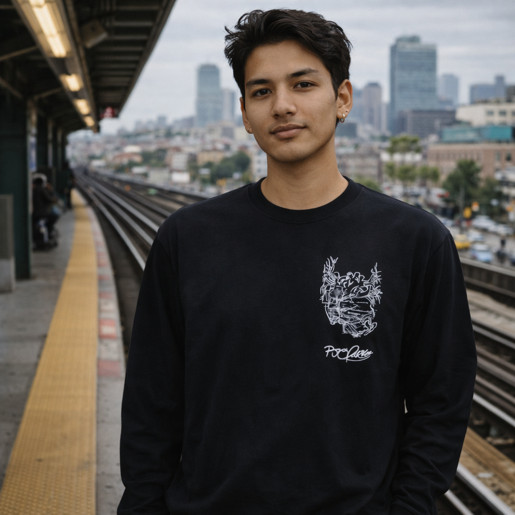 Printed front & back in crisp single-color linework, the graphic reads like an X-ray of the city’s circulation. Worn at Queensboro Plaza on a windy day; trains rattling overhead, platforms buzzing, & the river air cutting through; the piece feels exactly where it belongs.