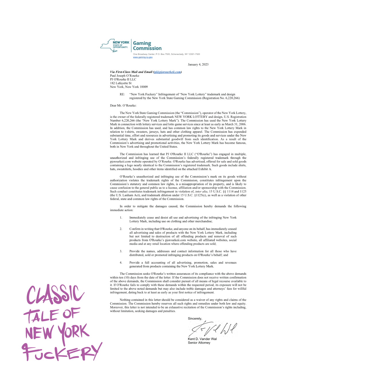 “New York Fuckery” takes the city’s chaos and stamps it into a lavender seal you can wear — a parody of officialdom that got a little too real. The original drop sparked legal threats from the New York State Gaming Commission, who claimed the mark “diluted their well-known brand.”