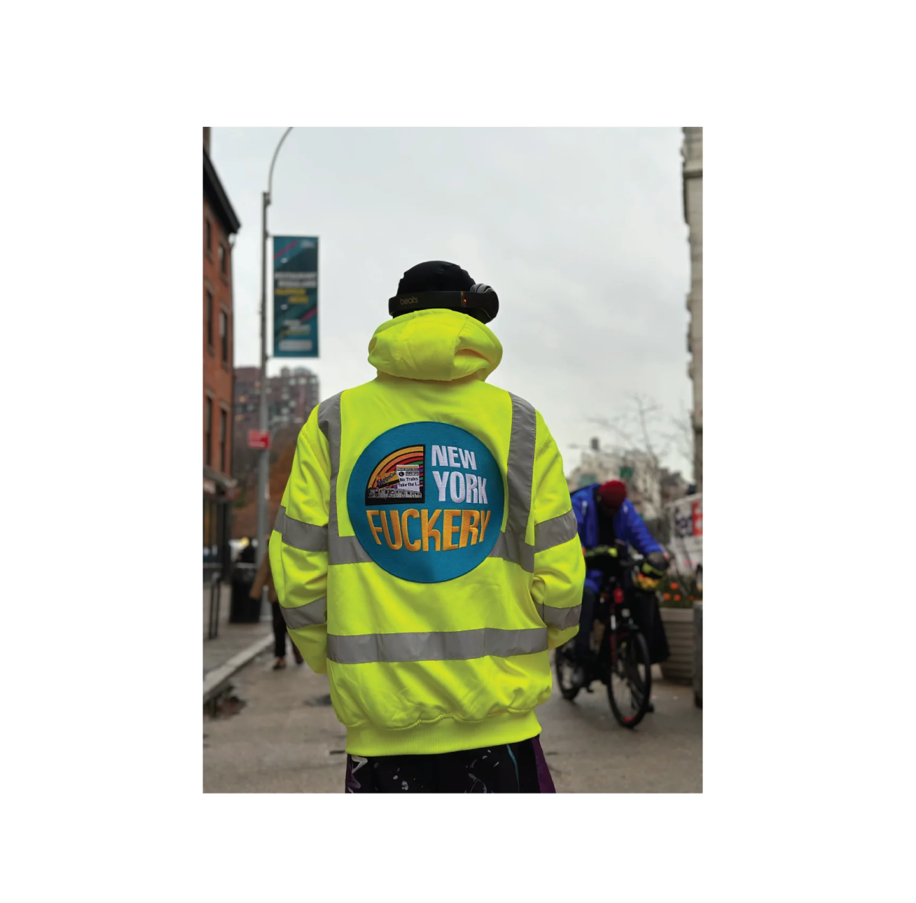 The New York Fuckery Construction Jacket is a tribute to the city’s most permanent temporary condition: scaffolding that never comes down, jackhammers at 7:01am, cones that multiply overnight, and crews standing around a hole like it’s a sacred monument.