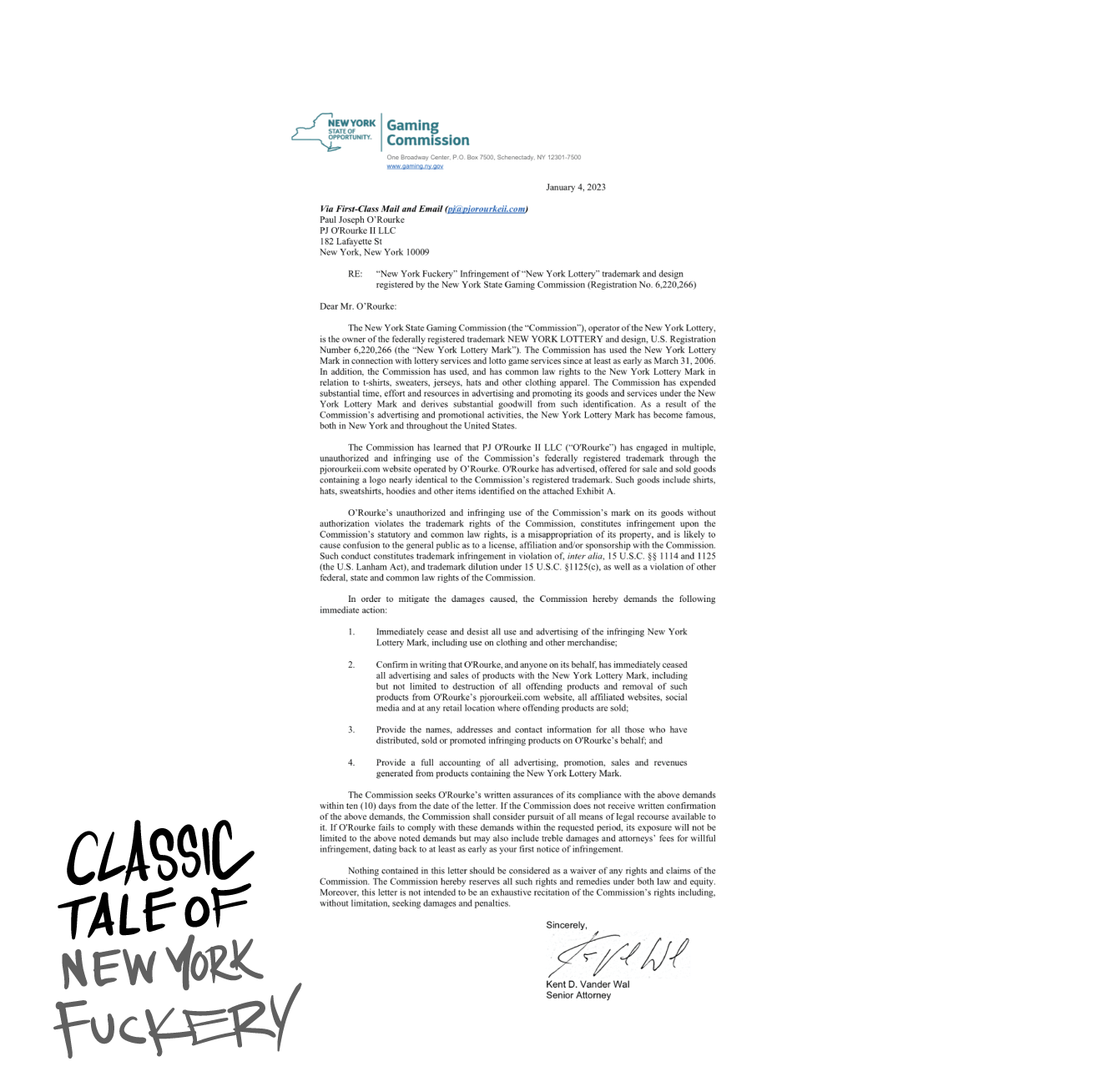 “New York Fuckery” takes the city’s chaos and stamps it into a cement grey garment dye seal you can wear; a parody of officialdom that got a little too real. The original drop sparked legal threats from the New York State Gaming Commission, who claimed the mark “diluted their well-known brand.”