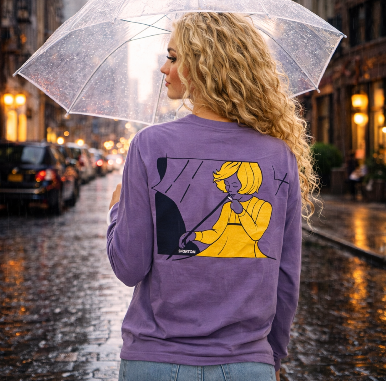 The Snorton Salt long sleeve is printed on a 6oz. 100% cotton tee; breathable but still heavy feel, & easy to layer when the weather turns cinematic. The lavender base sets the mood, while navy & yellow inks bring the illustration to life like streetlights on wet pavement.
